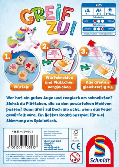 Wer hat ein gutes Auge und reagiert am schnellsten? Siehst du Plättchen, die zu den gewürfelten Motiven passen? Dann greif zu! Doch gib acht, wenn das Feuer gewürfelt wird. Ein flottes Reaktionsspiel für viel Stimmung am Spieletisch.