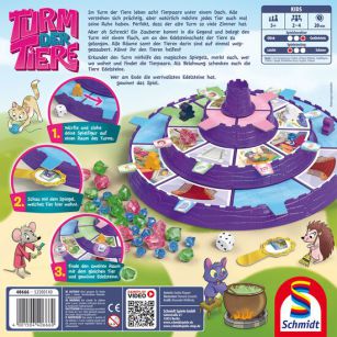 Im Turm der Tiere leben acht Tierpaare unter einem Dach. Alle verstehen sich prächtig, aber natürlich möchte jedes Tier auch mal seine Ruhe haben. Perfekt, dass der alte Turm so viele Zimmer hat. Aber oh Schreck! Ein Zauberer kommt in die Gegend und belegt den Turm mit einem Fluch, um an den Edelsteinschatz der Tiere zu gelangen. Alle Räume samt den Tieren darin sind auf einmal weggezaubert. Könnt ihr den Tieren helfen? Erkundet den Turm mithilfe des magischen Spiegels, merkt euch, wer wo wohnt und findet die Tierpaare. Als Belohnung schenken euch die Tiere Edelsteine. Wer am Ende die wertvollsten Edelsteine hat, gewinnt das Spiel.