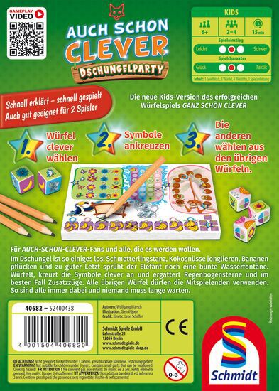 Für AUCH-SCHON-CLEVER-Fans und alle, die es werden wollen. Im Dschungel ist so einiges los! Schmetterlingstanz, Kokosnüsse jonglieren, Bananen pflücken und zu guter Letzt sprüht der Elefant noch eine bunte Wasserfontäne. Würfelt, kreuzt die Symbole clever an und ergattert Regenbogensterne und im besten Fall Zusatzzüge. Alle übrigen Würfel dürfen die Mitspielenden verwenden. So sind alle immer dabei und niemand muss lange warten.