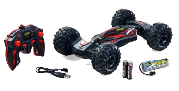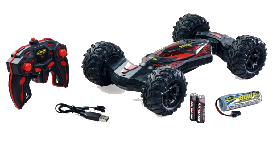 Magic Moment – Mit einem Knopfdruck wird Dein extrem flacher Racer ein vollwertig allradgetriebener Geländewagen, oder stellt sich bei Querlage sofort wieder auf und bringt sich in Position zum Weiterbashen. Mit der „Magic Machine 2.0“ von CARSON ist fast nichts unmöglich: Über den Asphalt jagen im Race-Modus, Hindernisse mit einem Backflip meistern, sich überschlagen und auf dem Rücken weiterfahren... Durch das unterschiedliche Design der Ober- & Unterseite des Fahrzeugs wird von einem Moment zum Nächsten im Handumdrehen ein anders aussehendes Fahrzeug! Die 2,4 GHz Fernsteuerung erstrahlt im Gamecontroller-Look. Wird das Gelände beim Fahren zu rau, ist das Fahrzeug per Knopfdruck am Sender in einen geländetauglichen Offroader mit beachtlicher Bodenfreiheit verwandelt und in Position gebracht. Die großen Gummireifen mit extrem griffigem Profil verleihen der Magic Machine genügend Grip auf jedem Untergrund. Eine spezielle Konstruktion lenkt die Vorder- und Rückeinheit deiner Machine separat, sodass der Renner an beiden Achsen gleichzeitig gelenkt wird. Abgerundet wird das Gesamtpaket durch den 100 % kompletten Lieferumfang, bestehend aus Fahrakku, Ladegerät, Senderbatterien und Anleitung. Viel Spaß mit deiner Magic Machine 2.0 von CARSON. Kaufen – Laden – Fahren!